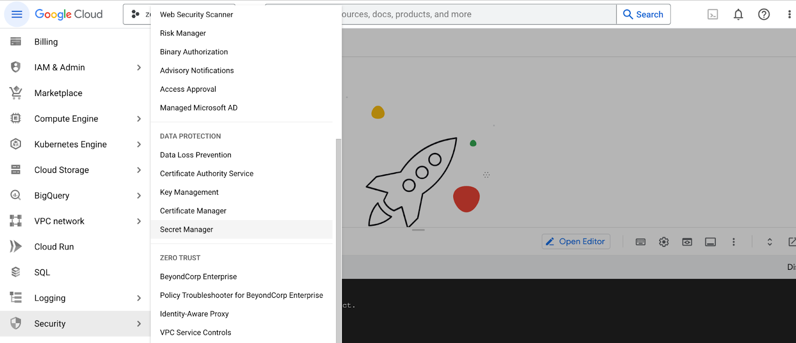 Create a new project from the GCP Console. Then, from the Navigation Menu, select “Cloud Shell Editor”. Your support representative will provide you with a ZIP file containing the function code and the Terraform template.