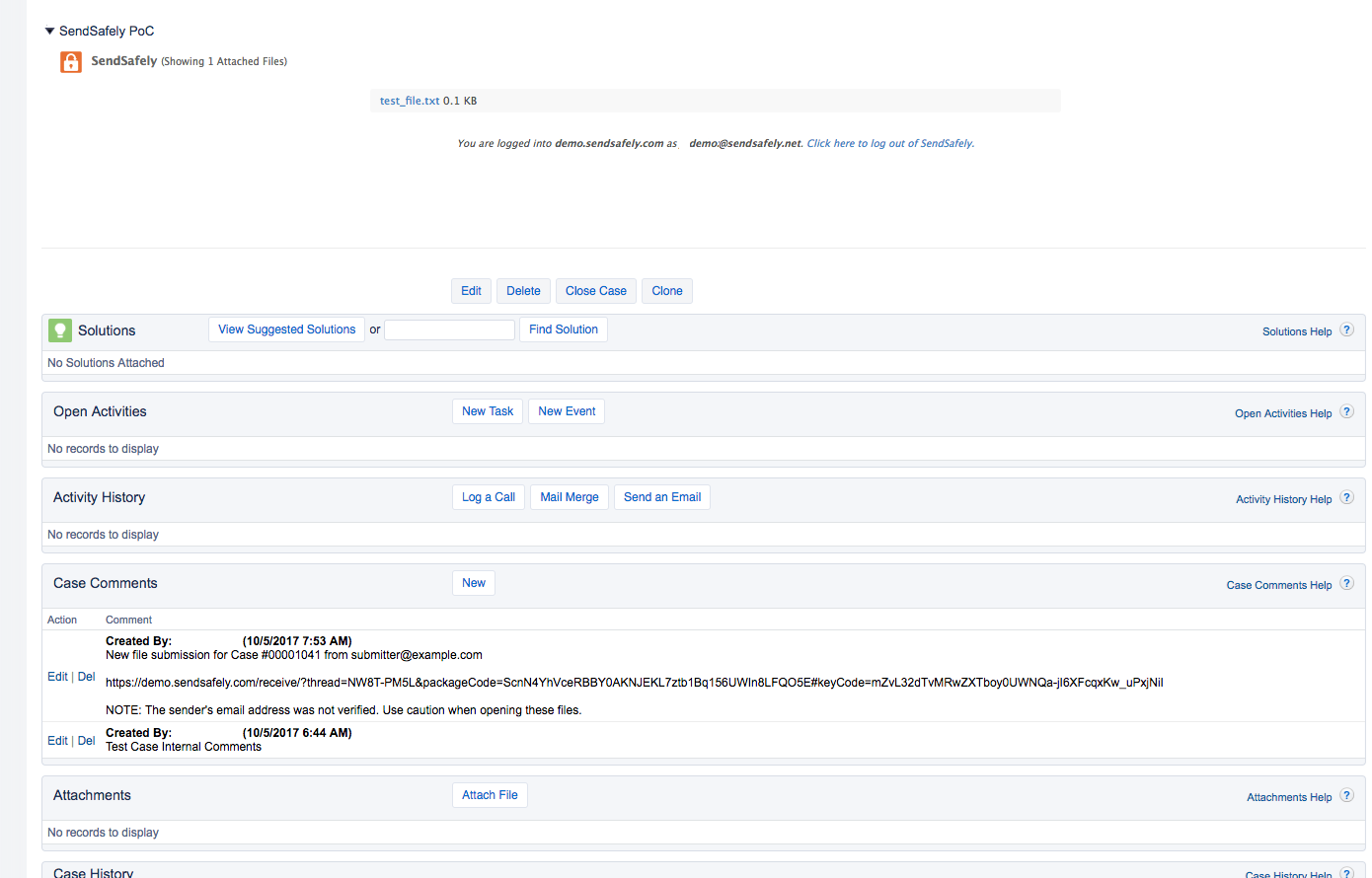 Return to your Salesforce instance, and refresh the browser displaying the ticket, and you should see the Case Comments have been updated with a new comment including the SendSafely-generated link, and the uploaded file available for download from the SendSafely Canvas application.